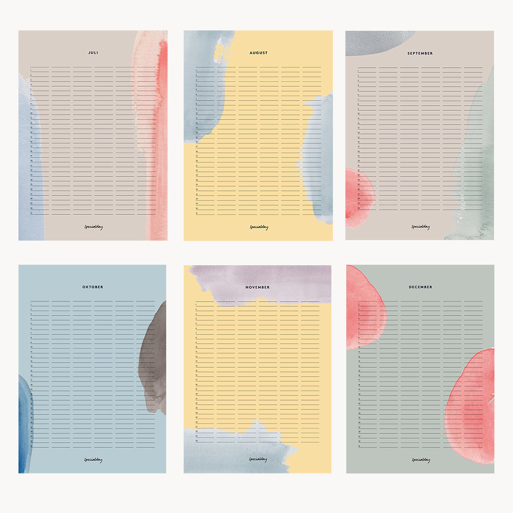 Få styr på hele familiens planer med Specialdays' elegante månedsplanner. Kalenderen er dekoreret med håndmalede akvarelillustrationer og trykt på papir i høj kvalitet – både praktisk og æstetisk smuk på væggen eller opslagstavlen.