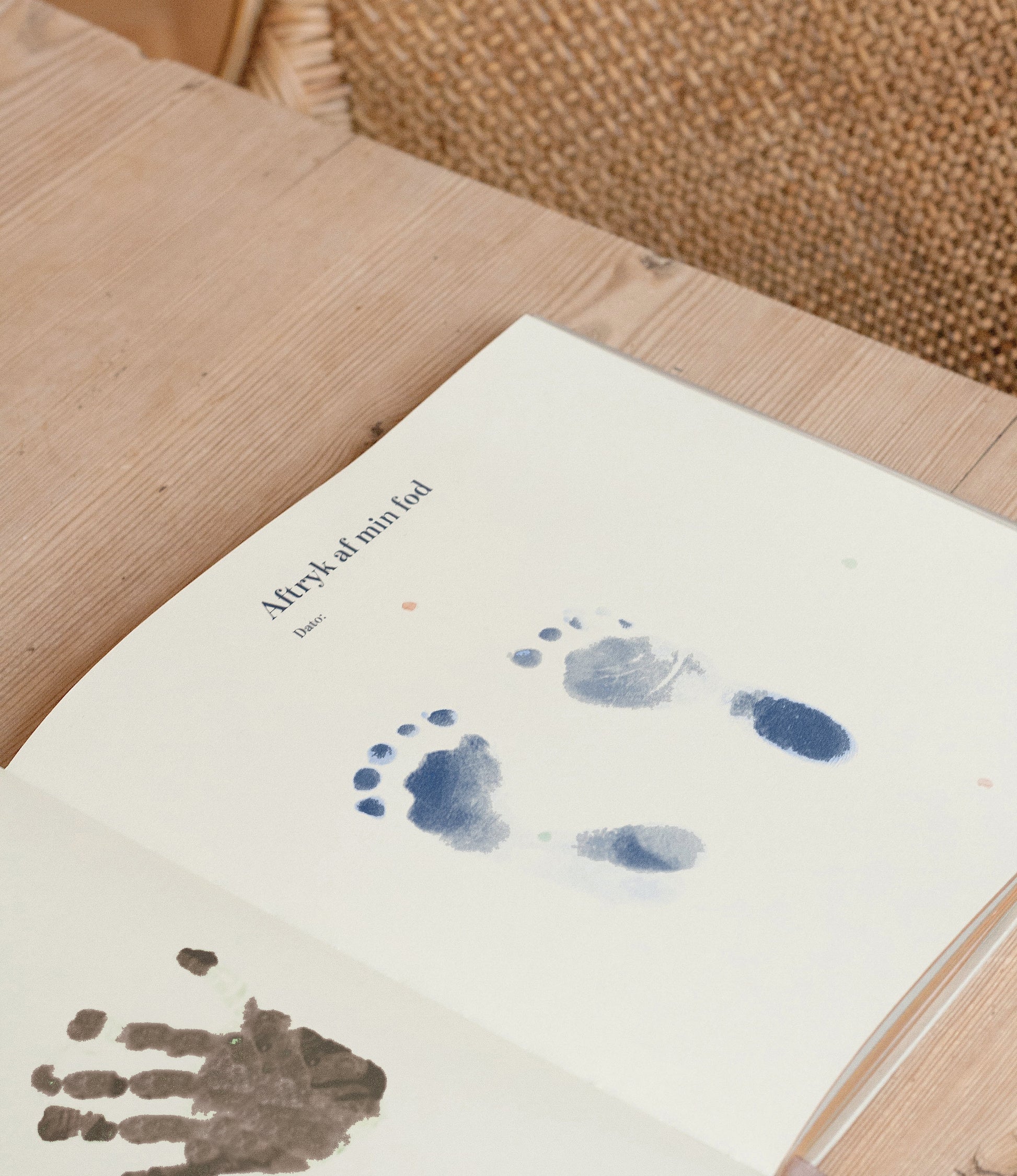 Hånd- og fodaftryk til baby og små børn i fine farver der passer til siderne i barnets bog fra Specialday.