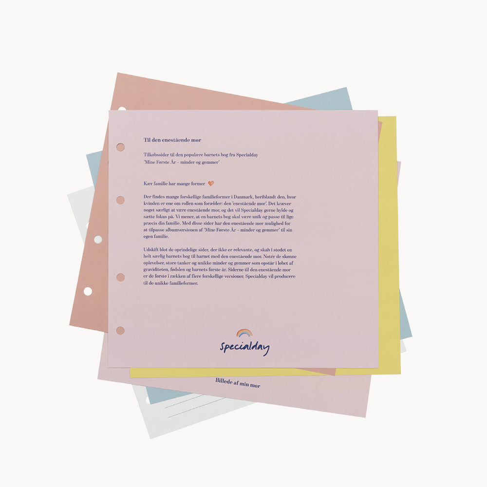 Der findes mange forskellige familieformer i Danmark, heriblandt den, hvor kvinden er ene om rollen som forælder: den 'enestående mor'. Det kræver noget særligt at være enestående mor, og det vil Specialday gerne hylde og sætte fokus på. Vi mener, at en barnets bog skal være unik og passe til lige præcis din familie. Med disse sider har den enestående mor mulighed for at tilpasse albumversionen af 'mine første år - minder og gemmer' til sin egen familie.