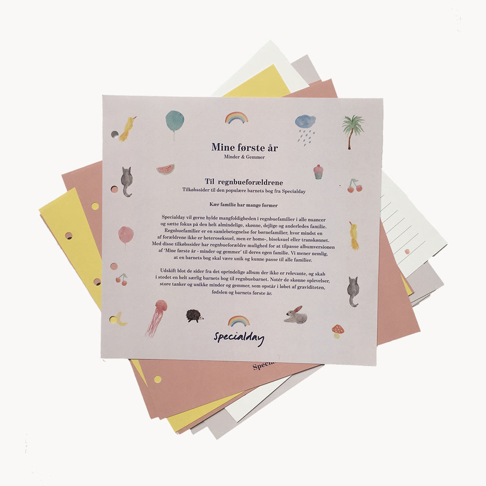 Specialday vil gerne hylde mangfoldigheden i regnbuefamilier i alle nuancer og sætte fokus på den helt almindelige, skønne, dejlige og anderledes familie. Regnbuefamilier er en samlebetegnelse for børnefamilier, hvor mindst en af forældrene ikke er heteroseksuel, men er homo-, biseksuel eller transkønnet. Med disse tilkøbssider har regnbueforældre mulighed for at tilpasse albumversionerne af ’mine første år - minder og gemmer’ til deres egen familie. Vi mener nemlig, at en barnets bog skal være unik og kunne passe til alle familier.